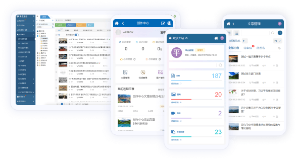 平台同时支持后台管理和前端的多终端访问与操作。左侧为PC端后台管理界面,右侧为移动端访问页面:系统采用同一域名、后台和数据库,多屏优化技术可根据设备类型呈现相应的操作界面。后台内容管理和编辑功能针对手机场景进行了优化,使管理员能够在手机和平板等移动设备上高效完成日常办公和信息发布。