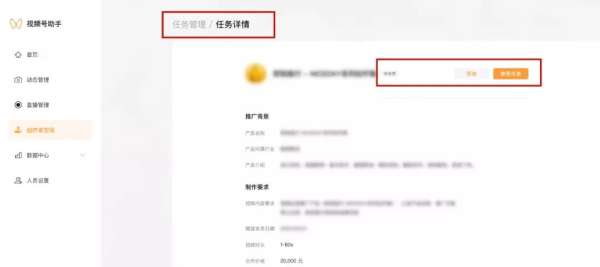 在“通知中心”或“任务管理任务列表”中,视频号流量主可查看到待投放的广告任务信息,任务详情中包含推广背景、视频内容要求、期待发表日期、广告素材等具体信息。视频号流量主确认接单后,方可查看广告主的联系方式。