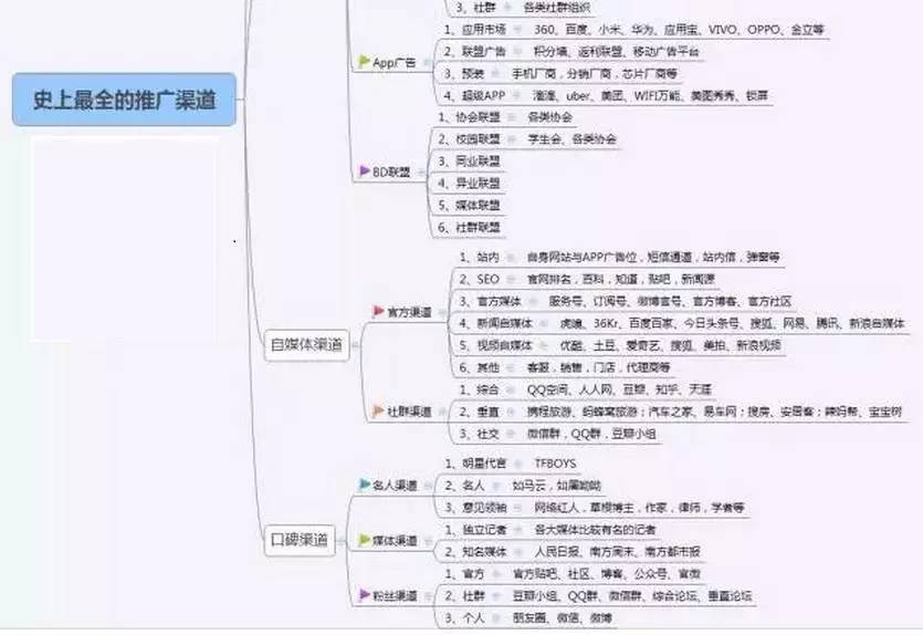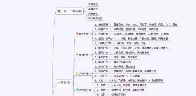 我将推广渠道分为付费渠道,自媒体渠道,口碑渠道。付费渠道又分为:线上广告、媒体广告、户外广告、社会化广告、App广告、BD联盟。自媒体又分为:官方渠道,论坛渠道,社群渠道。口碑渠道又分为:名人渠道、媒体渠道、粉丝渠道。