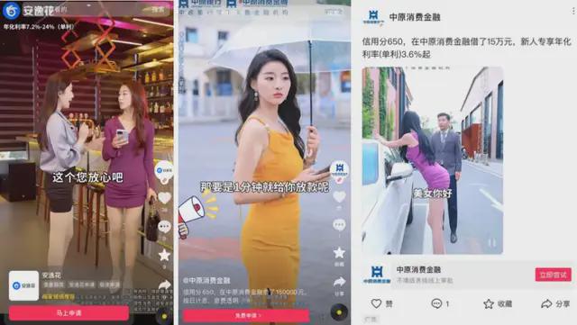 在抖音平台上,部分消费金融公司的主流场景类广告,已经从之前的“劝农民工办网贷乘飞机升舱”这类模式,转变为“美女主持人采访商务人士进而查询借钱额度”的情景。