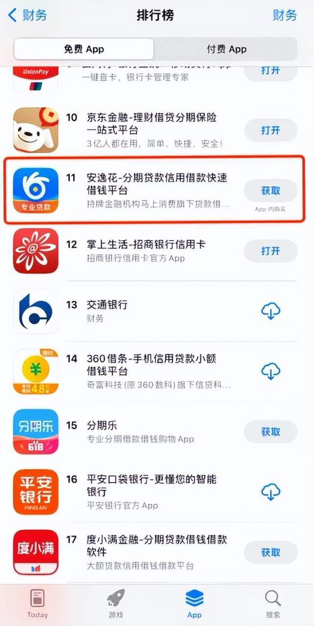 根据苹果手机APPStore的财务免费app排行榜,马上消费金融旗下的安逸花排名第11名,仅次于背靠京东的京东金融,高于招商银行信用卡官方APP掌上生活,以及交通银行官方APP、360借条、分期乐、平安口袋银行和度小满金融等众多知名产品。