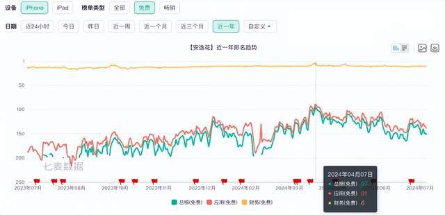 根据移动应用数据分析平台七麦的数据来看,马上消费金融旗下产品安逸花在苹果手机APPStore的排名近一年来相对稳定,均处于前列。今年4月7日,甚至冲到了财务免费榜的第6名,总榜免费榜的97名。此外,马上金融、优逸花的排名也在前100行列。
