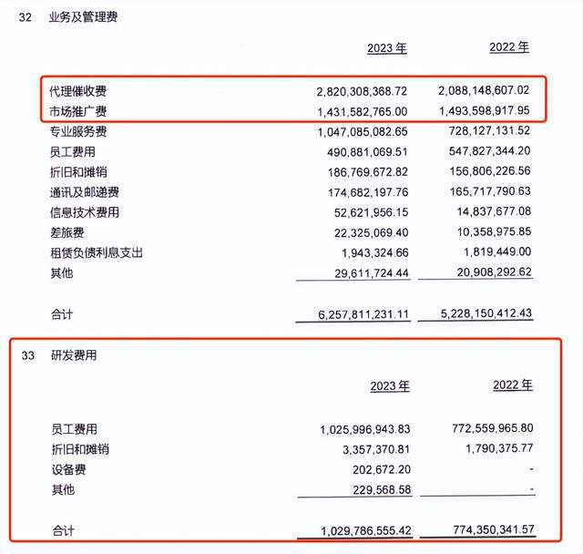 即使拥有强大的科技实力作为支撑,马上消费金融2023年代理催收费依然达到了惊人的28.20亿元,较2022年的20.88亿同比提升35%。而同期马上消费金融的研发费用为10.30亿元,远远低于代理催收费的支出。