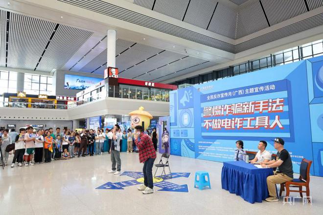 央广网南宁7月13日消息(记者梁瑜琳)反诈节目、互动游戏开云Kaiyun官方网站、反诈宣讲……7月13日上午,广西全民反诈宣传月“警惕新手法 不做电诈工具人”主题活动在南宁东站火热进行,现场开展了形式多样的反诈宣传活动。过往旅客群众热情高涨,纷纷前来观看学习反诈知识。