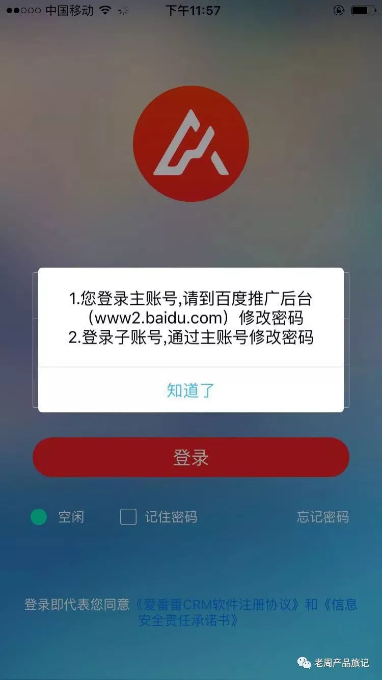 在这里,明显地指引到百度推广平台,企业主需要登录百度推广平台修改密码,换言之,企业主如果想成为爱番番的用户就必须要注册百度推广平台的账号。爱番番和百度推广平台共用一套账号管理体系。
