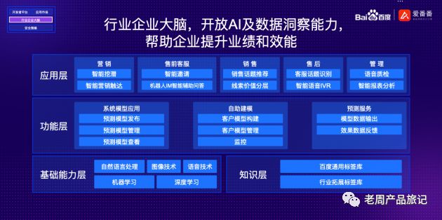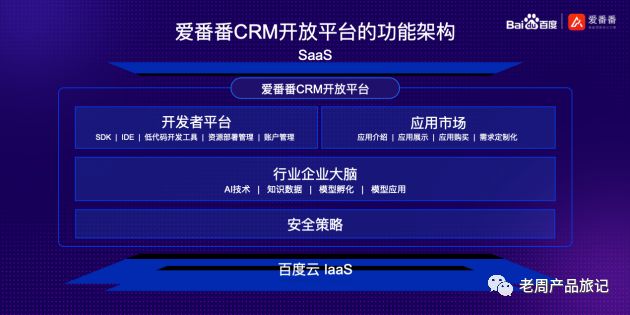 爱番番是百度推出的一款以CRM为核心的平台型产品,主要包含开发者平台、应用市场、行业企业大脑等三大模块。对于爱番番的产品定位,百度的解读是:“基于AI技术能力和营销洞察赋能CRM服务商,为客户提供更好的CRM产品和服务。通过深度整合营销+销售全流程,致力于帮助商家联结、洞察和转化顾客,实现数字化管理,达到业绩番番。”