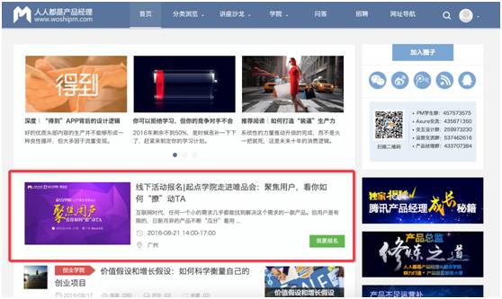 利用产品官网来推广活动,在站内最显眼的地方,或者用户最关注的板块添加你的活动引导信息,这样能够最快速地吸引用户关注活动。可以将近期首推的活动做一个banner 图放在首页,或者直接把活动内容板块放在首页轮播图下面,像人人都是产品经理的线下活动。
