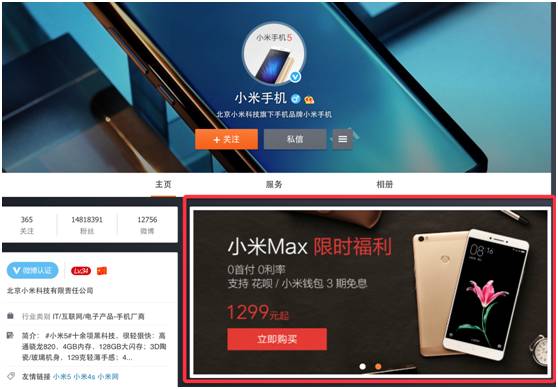 除了微信平台可以打广告,微博也是一个大流量渠道。像小米手机5最近做降价200元的活动,就在首页的广告位展示了活动信息。