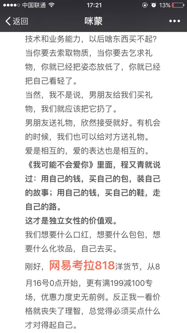 微博上打广告的段子手也越来越多,甚至有明星也加入了段子手的行列,薛之谦和大张伟这对好兄弟曾经帮洋码头写段子打广告。据说咪蒙的广告报价在7月份就达到45万一篇,估计现在超过50万软妹币了。